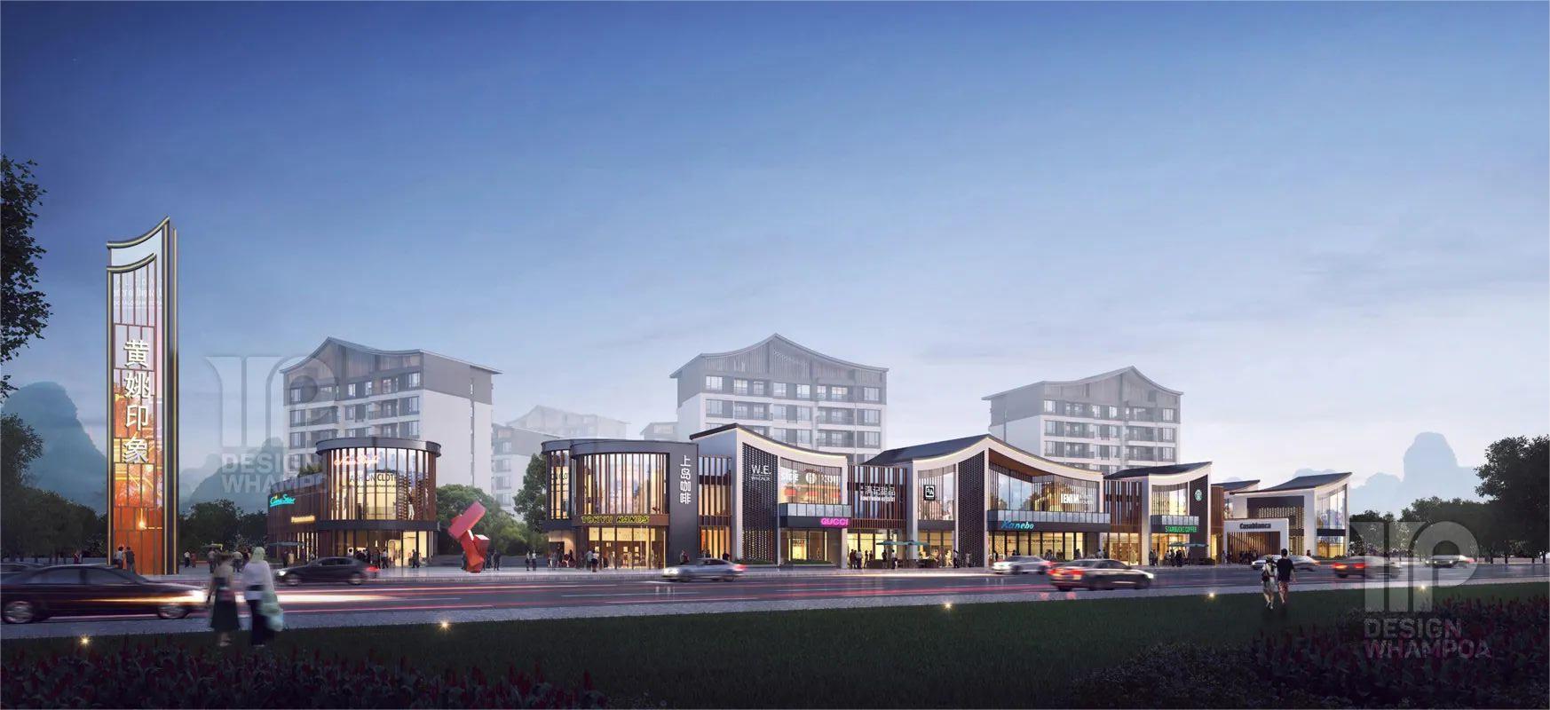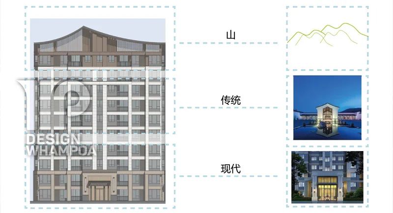 立面風(fēng)格在于意境的營造,造型采用現(xiàn)代中式風(fēng)格,在附屬用房及住宅的屋頂、采用現(xiàn)代中式造型,塑造簡練流暢的現(xiàn)代風(fēng)格且富有黃姚當(dāng)?shù)仫L(fēng)格建筑的立面。